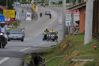 We (Ah Seng and I) were flag off at around 9.45 AM and not long after our ride we were caught up by a very heavy wind at Klebang area then followed by a heavy rain. We took shelter at some shoplots. Well, we can only considered how lucky we were as the rain came only after the flagging off. Malacca hasn’t been raining for quite sometime so that’s a good sign, good for everyone and a good sent off for the trishaw man team.